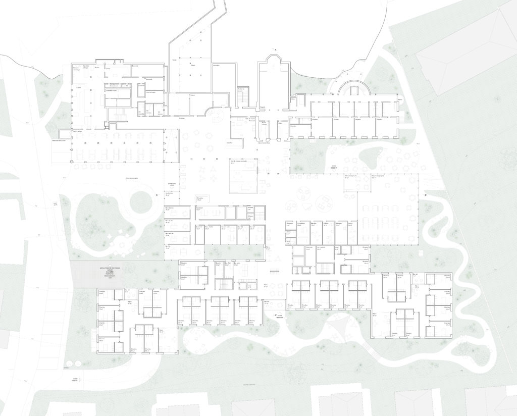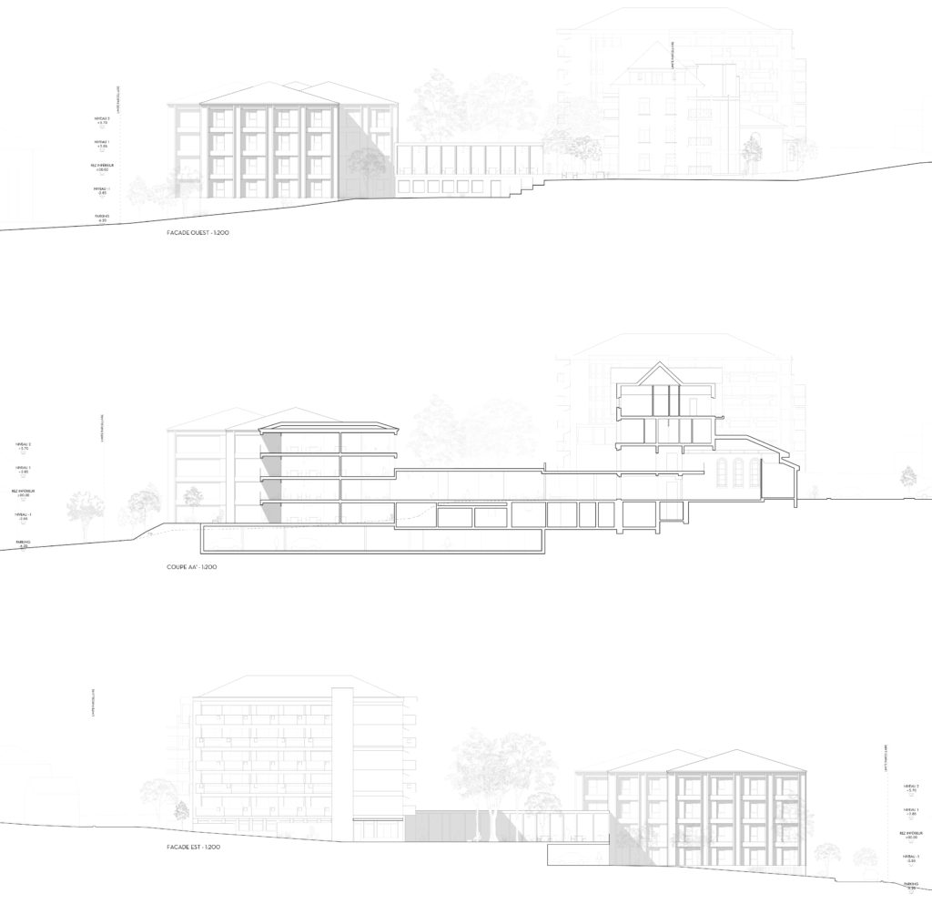 This constructive approach makes it possible to develop a more sustainable and lightweight architecture for care facilities in Switzerland, adapted to the local context and construction traditions. The connection with the existing building is made through a low transparent volume conceived as a shared space that encourages movement, encounters and continuity between the different parts of the complex.