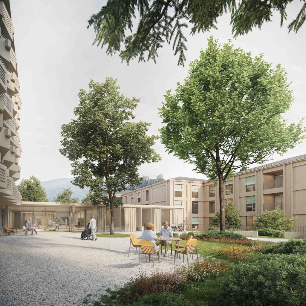 These exterior spaces extend the interior living areas and play an essential role in the design of care architecture in Switzerland, where the connection to the site, the landscape and natural light is fundamental.