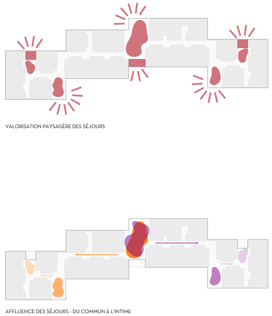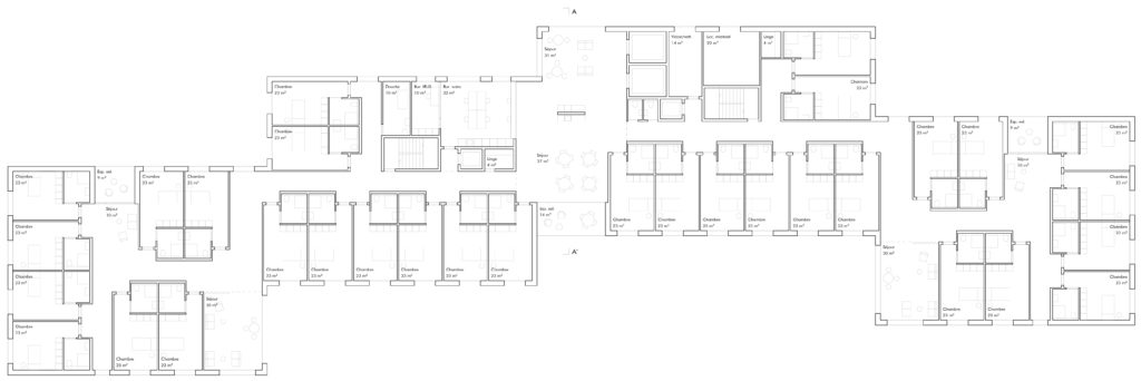 The project EMS St-François Sion organizes the living units in pairs over four levels, allowing different atmospheres and ways of inhabiting the building. Each floor includes a large through-living room acting as the social heart of the level, opening onto a south-facing loggia with panoramic views over the Rhône valley. These bright shared spaces support everyday interaction, while smaller corner lounges provide quieter areas for more intimate moments. Additional living rooms combined with loggias offer spaces at a more domestic scale, allowing residents to choose between collective and private environments.