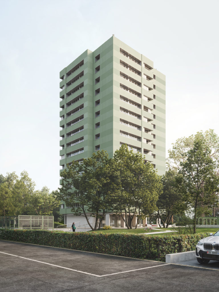 De plus, la palette de teintes, composée de nuances subtiles de verts et de gris, dialogue avec la végétation alentour. Elle accentue l’élégante sobriété de la tour et renforce son intégration dans le quartier.