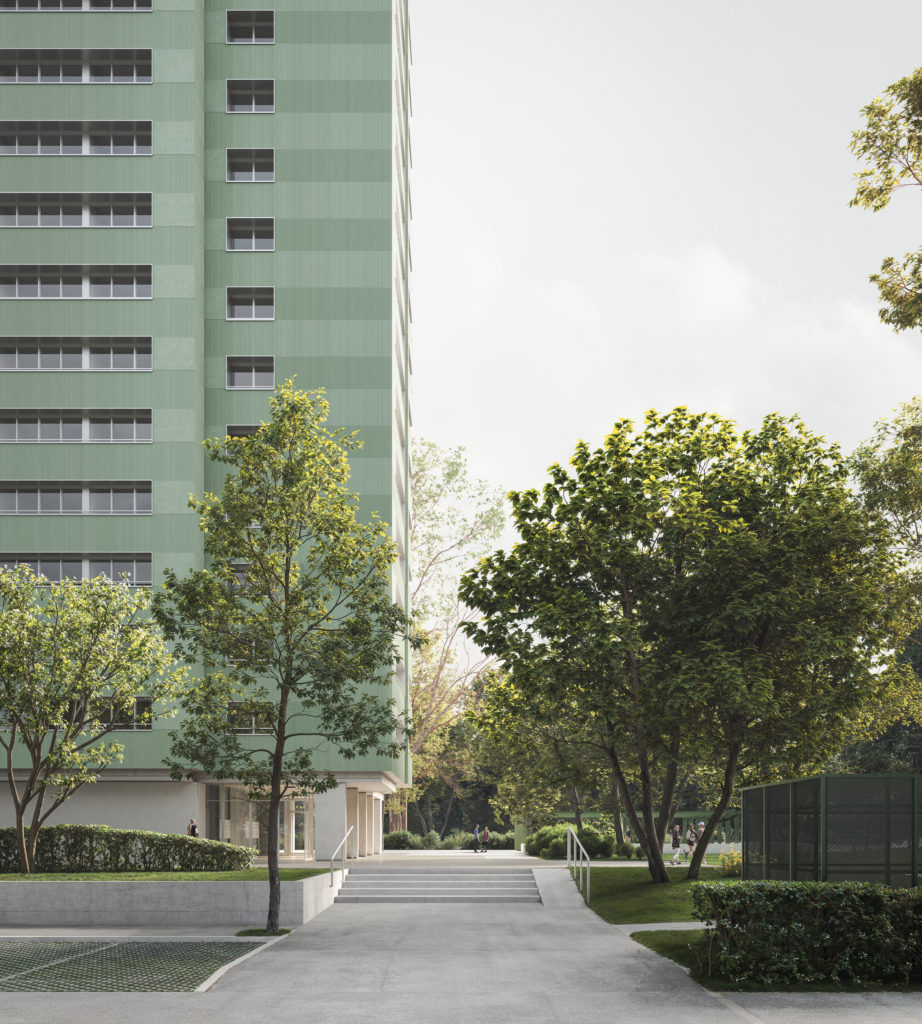 Par ailleurs, le couronnement, légèrement surélevé, affine la silhouette de la tour et masque les éléments techniques. L’ensemble gagne en équilibre et en lisibilité.
